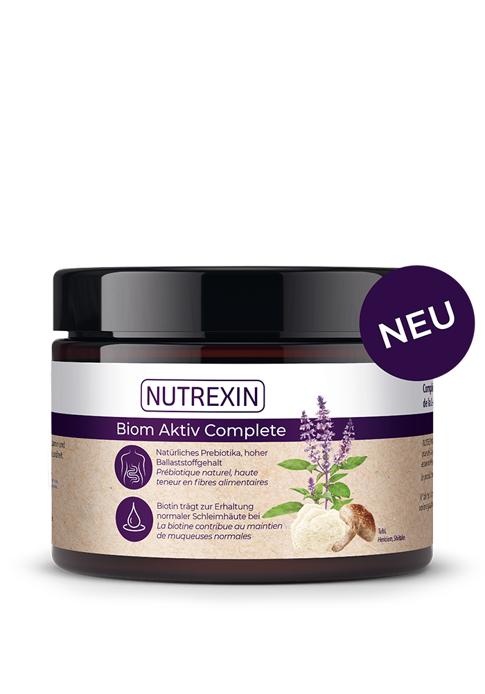 NUTREXIN Biom Aktiv Complete ist eine Mischung ausnatürlichen, pflanzlichen Bestandteilen (Akazienfaser, Agaven-Inulin, Flohsamenschale), Vitalpilzen und Biotin aus dem indischen Basilikum (Tulsi). Zusätzlich ist die Aminosäure L-Glutamin enthalten. Diese einzigartige Mischung liefert wertvolle Ballaststoffe für eine hervorragende Darmtätigkeit. Ergänzt durch Biotin aus Tulsikraut wird, zur Erhaltung einer normalen Darmschleimhaut sowie zur normalen Funktion des Nervensystems, beigetragen.